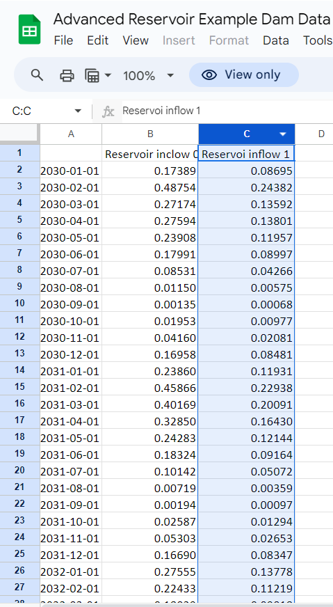 2. قم بإنشاء سيناريو جديد يسمى **«سيناريو جاف»** عن طريق استنساخ **«سيناريو الطلب مع GW»**. في هذا السيناريو الجديد، قم بتحديث معلمة تدفق مستجمعات المياه على عقدة التجميع إلى السلسلة الزمنية الموجودة في العمود **«تدفق الخزان 1"** من الرابط أدناه.
