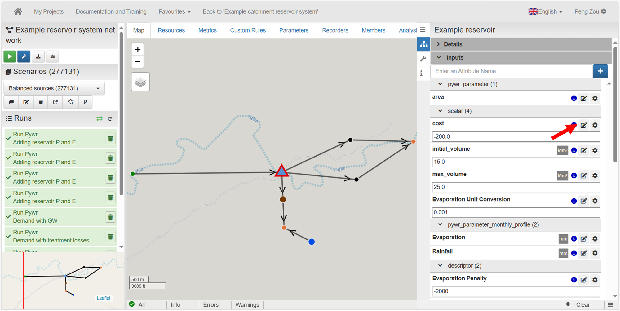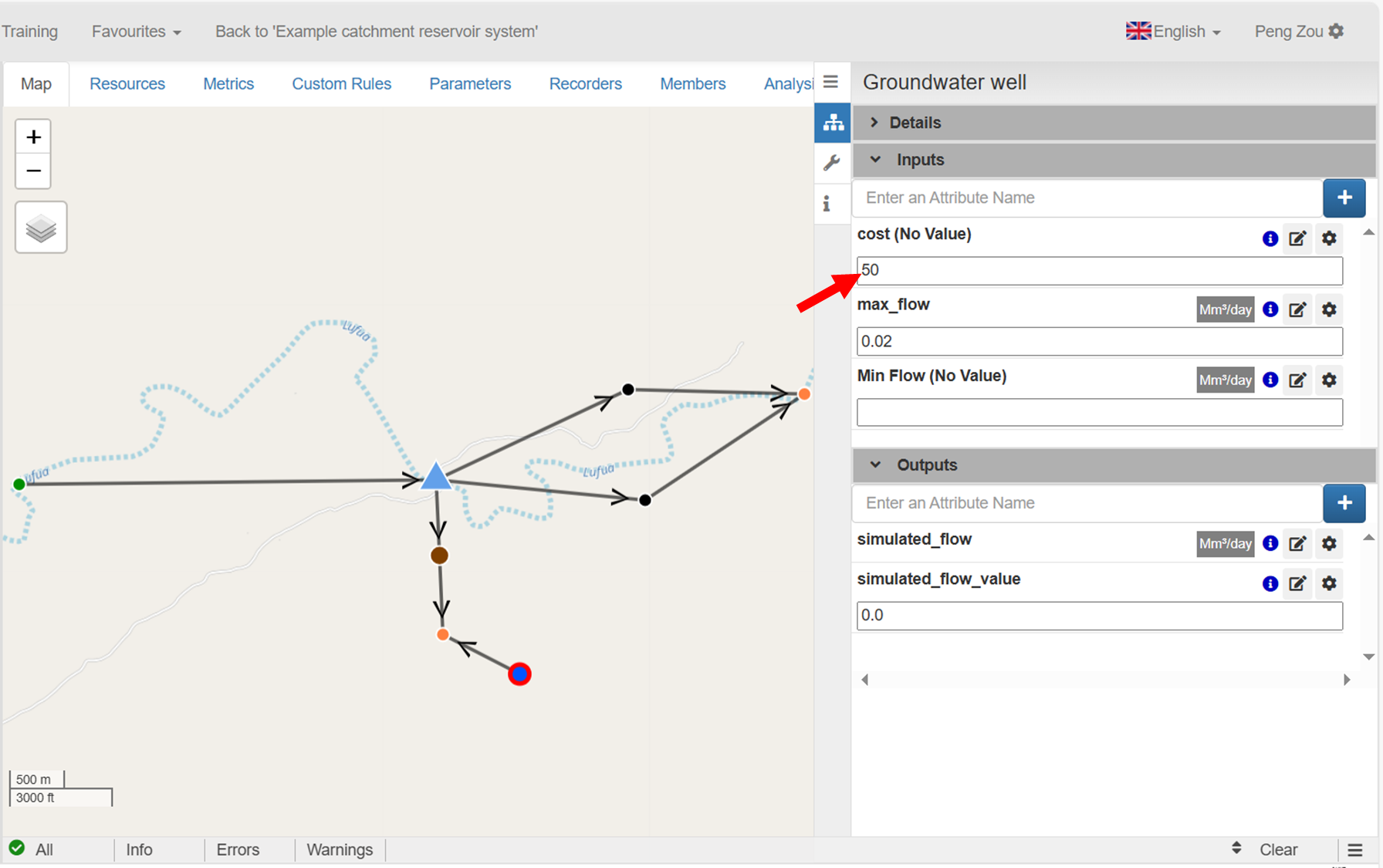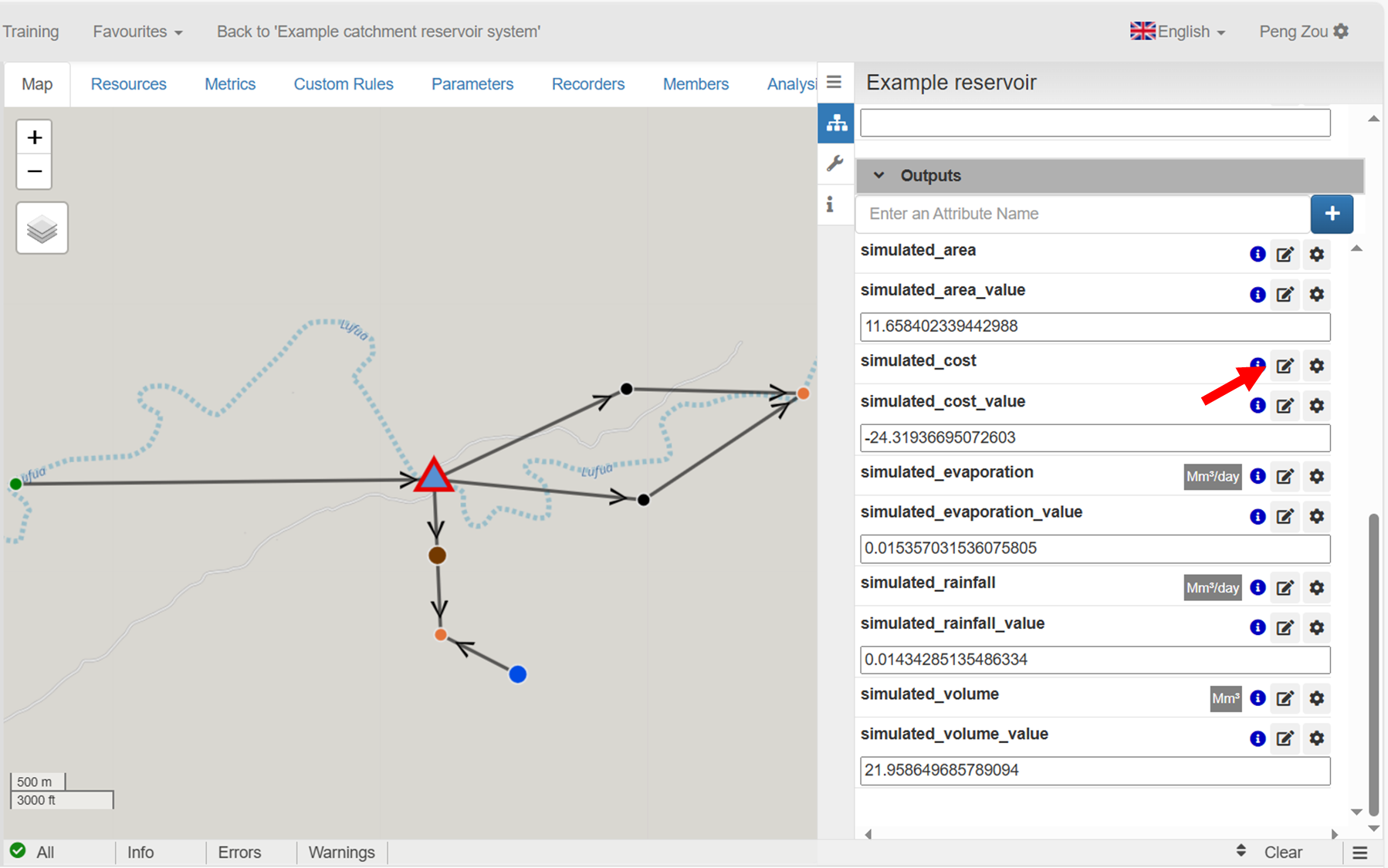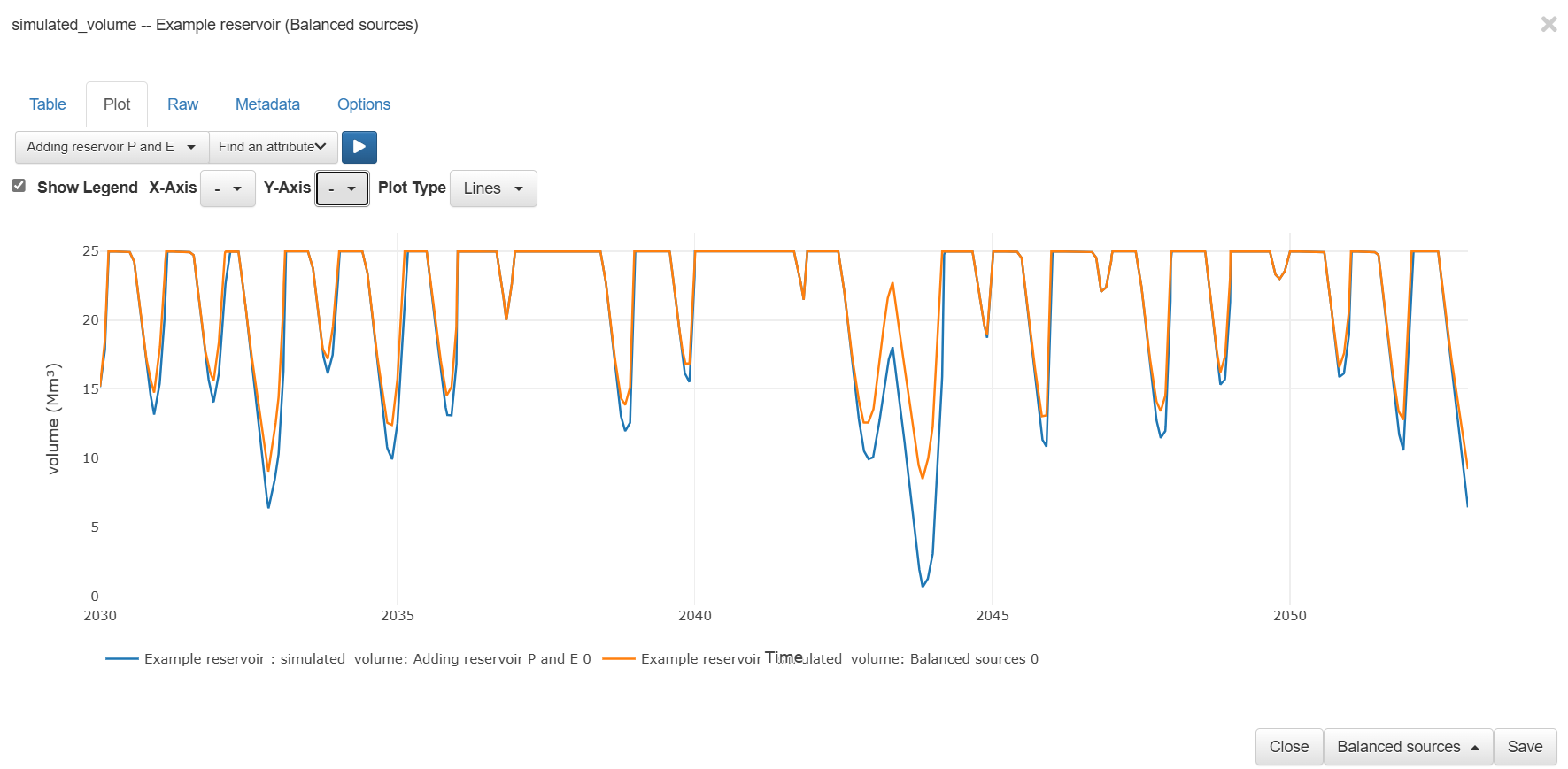 5. ماڈل چلائیں اور دیکھیں **تقلید شدہ\_بہاؤ** پانی کے زمینی ان پٹ نوڈ کا اور اس سے موازنہ کریں **جی ڈبلیو کے ساتھ مطالبہ؛** اور **تقلید شدہ\_حجم** ریزروائر نوڈ کا اور دونوں کا موازنہ کریں **ذخائر P اور E شامل کرنا**.