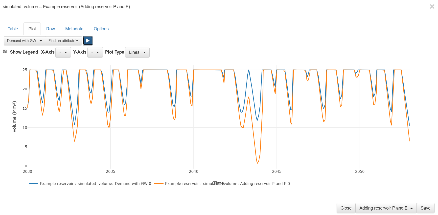 6. Ejecute este escenario y compare el volumen simulado con el **«Demanda con GW»** escenario.