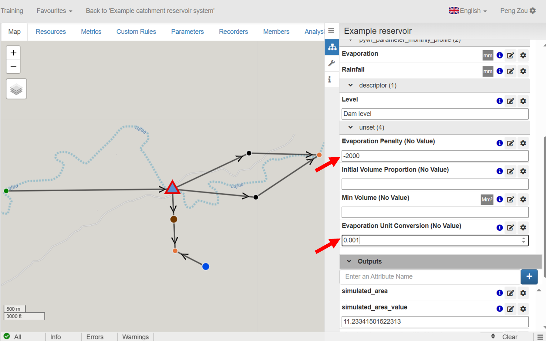 5. Finalmente, configure el **Penalización por evaporación** a -2000 y el **Conversión de unidades de evaporación** en el nodo del depósito a 0.001.