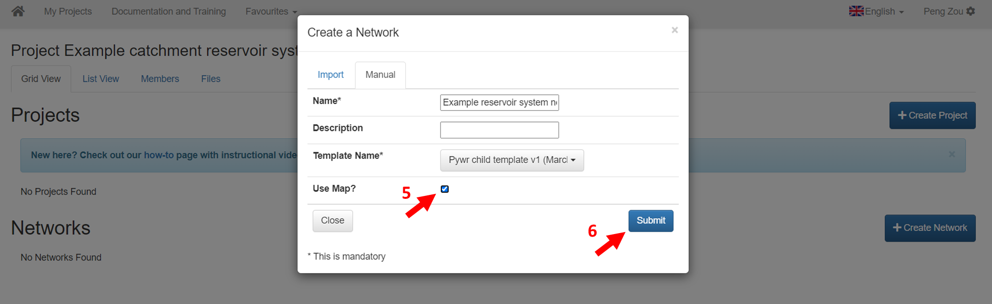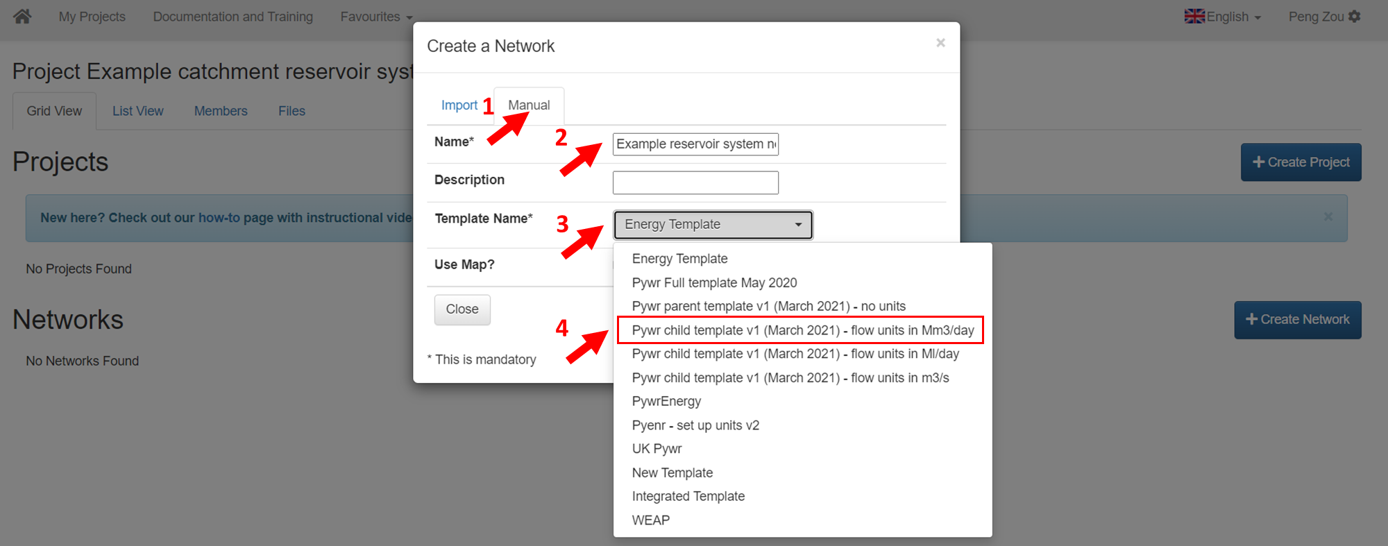 * Seleccione manual e introduzca el nombre de la red *\*\*«Ejemplo de red de sistemas de embalses» \*\** y selecciona el nombre de la plantilla según la captura de pantalla.