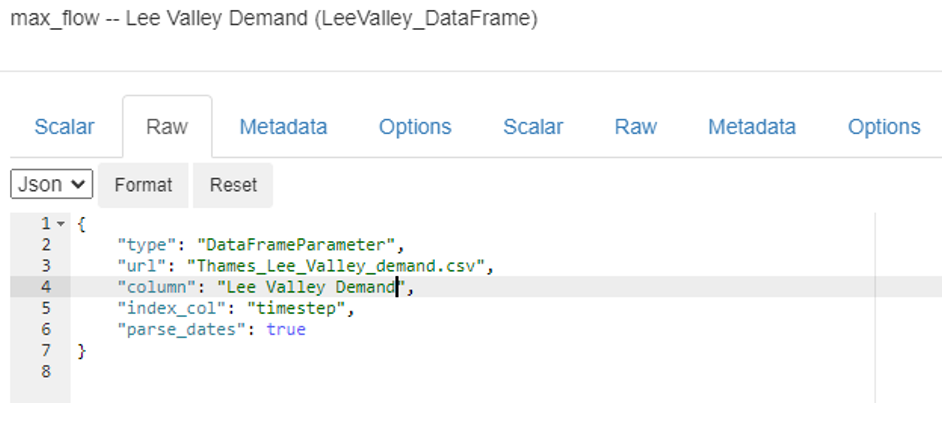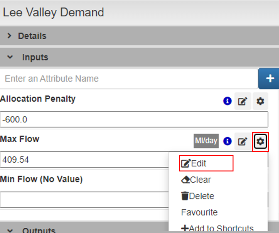 Seleccione el nodo de salida **Demanda de Lee Valley** y edite el **Flujo máximo**