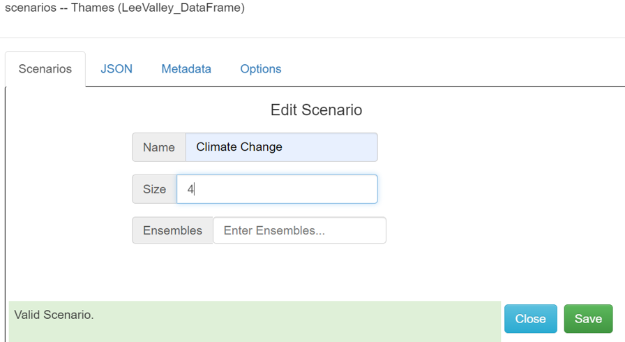 Como el archivo H5 contiene 4 marcos de datos por clave, esto requiere **tamaño**=cuatro (4). En este caso, el pywr-scenario se llamará **Cambio climático**, y no **Ensamble** los nombres se usarán para diferenciarlos.
