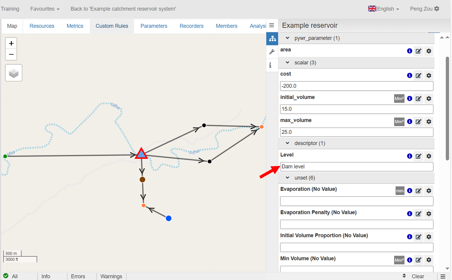 7\. È necessario fare riferimento al parametro Dam level sull'attributo Level sul serbatoio, per fare ciò, fai clic sul Reservoir e scrivi il nome del parametro nell'attributo Level (**Livello della diga).** Tieni presente che il nome fa distinzione tra maiuscole e minuscole.