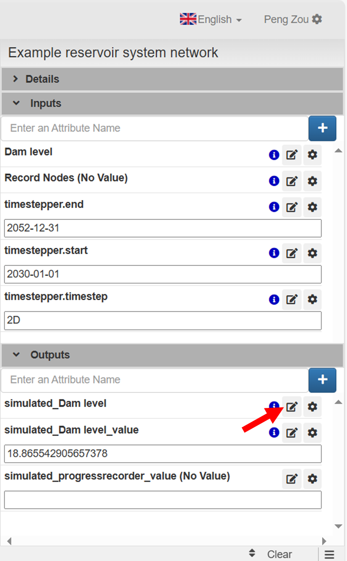 9. Lo vedrai perché **Livello della diga** il parametro non è definito sul nodo, **simulato\_livello** non viene emesso sul nodo del serbatoio. Invece di visualizzare l'output, fai clic su **Tasto Attributi di rete**.