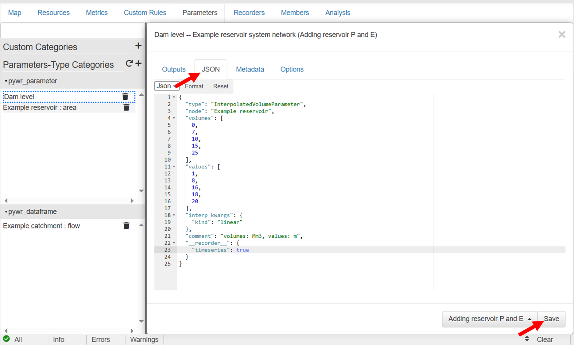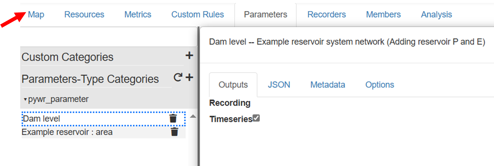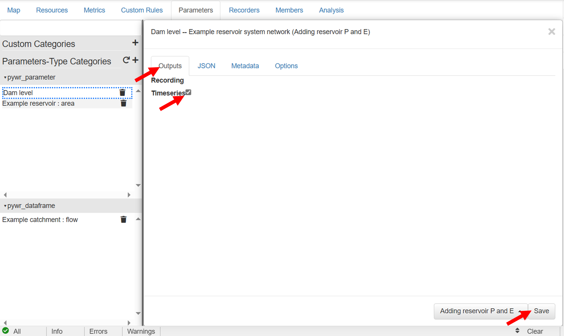 10. Clicca sul **simulato\_Livello diga.** Nota che il nome del nodo Reservoir è nel nome dell'output del parametro.