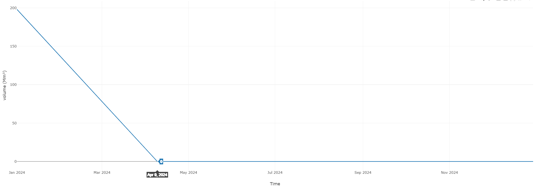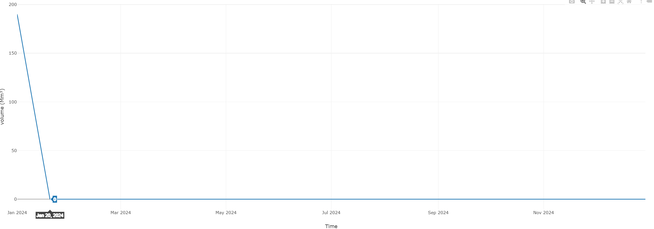 Il storage node inizia a riempirsi a partire dai 200 Mm³ iniziali come da condizioni iniziali fino a raggiungere la sua capacità massima di 365 Mm³. Una volta raggiunto questo volume massimo, l'acqua in eccesso verrà rilasciata. Questa capacità viene raggiunta da **gennaio 16, 2024**.