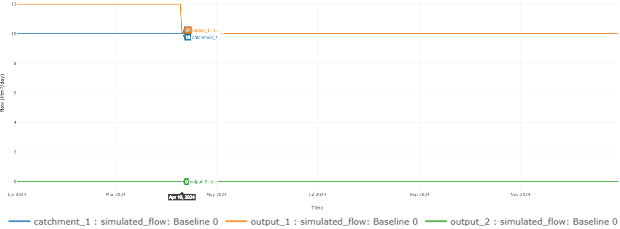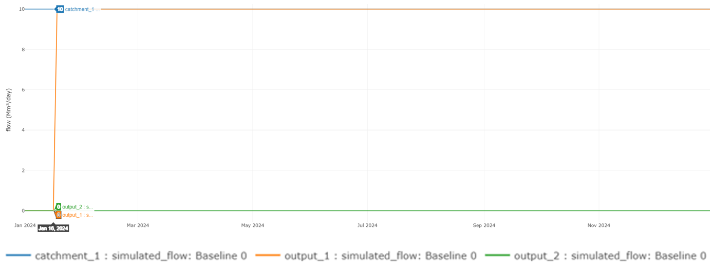 Le **uscita 1** il nodo tenta di consumare 12 MM³/giorno dal serbatoio, se disponibile. Nel frattempo, **bacino idrografico 1** il nodo contribuisce con 10 MM³/giorno al serbatoio. Ciò significa che il serbatoio dovrebbe diminuire di volume nel tempo, poiché fornirà più acqua di quanta ne riceve.