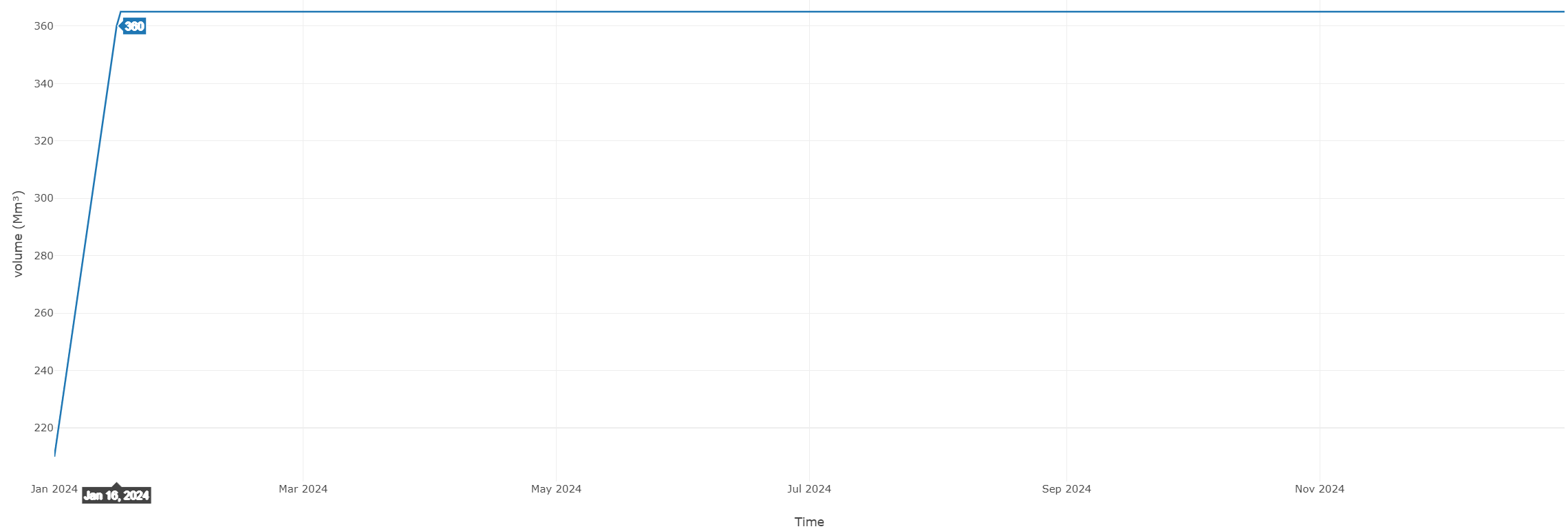 Il storage node inizia a riempirsi a partire dai 200 Mm³ iniziali come da condizioni iniziali fino a raggiungere la sua capacità massima di 365 Mm³. Una volta raggiunto questo volume massimo, l'acqua in eccesso verrà rilasciata. Questa capacità viene raggiunta da **gennaio 16, 2024**.
