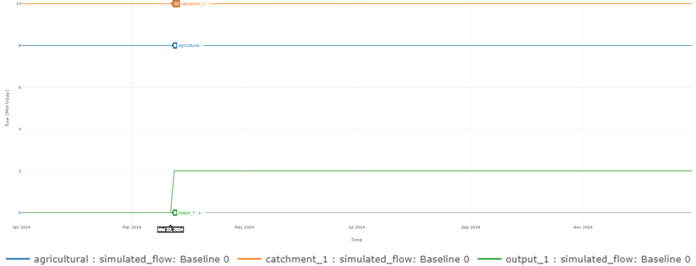I risultati mostrano che il volume del serbatoio aumenta fino a raggiungere il volume massimo **aprile 22, 2024**, indicando che dovrà rilasciare il volume extra. Il **il rilascio avviene attraverso la presa** nodo, poiché output1 non può richiedere più di 8 mm³/giorno. La quantità di acqua che viene rilasciata attraverso l'uscita è di 2 mm³/giorno, poiché è la differenza tra la quantità fornita dal bacino idrografico 1 e la quantità consumata dal nodo output1.