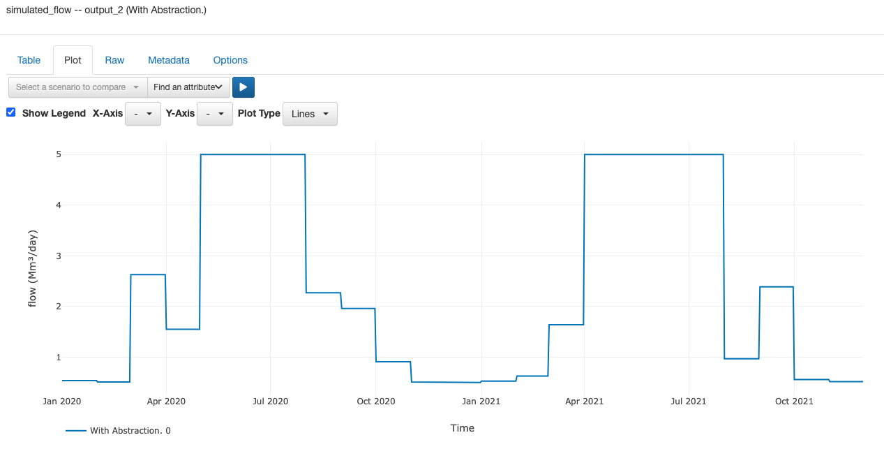 现在，供应给需求节点的水量不再为 0。需求节点试图抽象 5.0 mm3/天的水量。但是，当河里没有足够的水时，5.0 mm3/天就无法抽水。